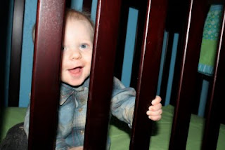 I decided to give our changing table to a good home and was looking for a picture to send the new recipient. I could have taken a picture of the actual changing table, but that would mean clearing the whole thing off as it is now used as a dresser/clothes organizer/junk table. I'm glad I was lazy and looking for an internet picture because I found out that our crib had been recalled in July. The manufacturer evidently went out of business sometime in 2008 and since then there have been two recalls concerning these cribs. Don't worry Heather, the changing table is just fine. I guess I just relied on the fact that, since I registered the product, I would get notified if it was recalled, but then I realized that I registered the product with the manufacturer and this was a vendor recall. So, the next morning, Hans took down the crib and we loaded everyone in the car to return and purchase a new crib. The return and purchase took us all of 20 minutes because I had all three guys with me, but I'm very pleased with our new crib. Gus seems to like it too.